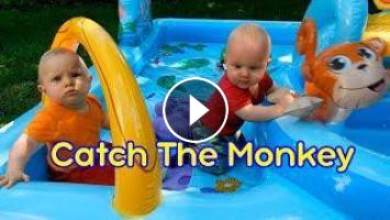 Double Bubble Boom presents funny twin babies challenge: catch the toy monkey. There is a funny twin babies video with cute twins funny moments and twin babies playing together and trying to catch the toy monkey in the swimming pool.